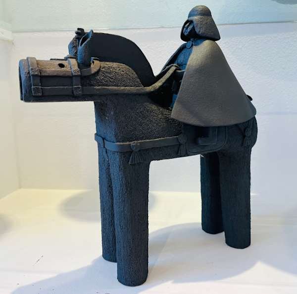 I have been working with clay for over 20 plus years, living in a rural surroundings with daily encounters with animals. My haniwa style horses and warriors were inspired by the tomb figures of 4th-7th century Japan, which are renowned for their stylistic simplicity and primitive sophistication.