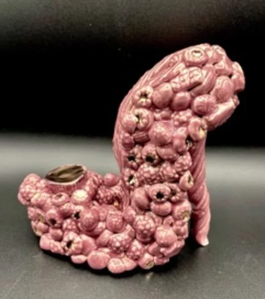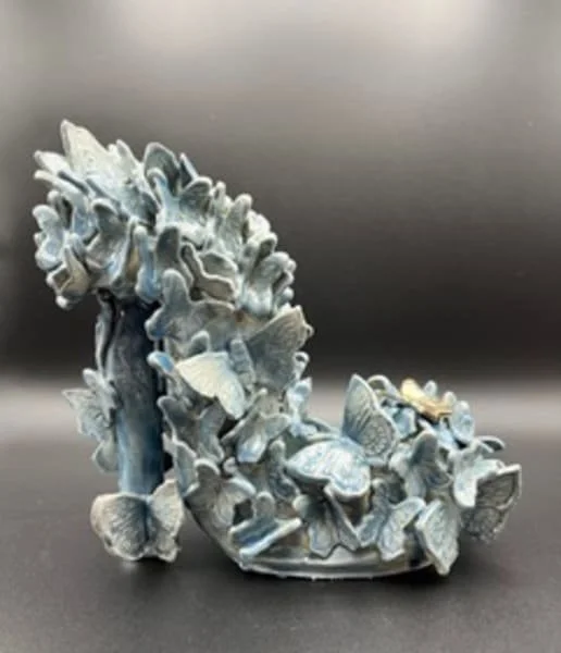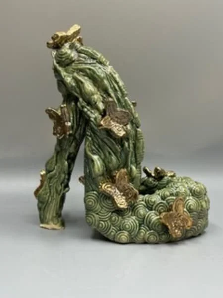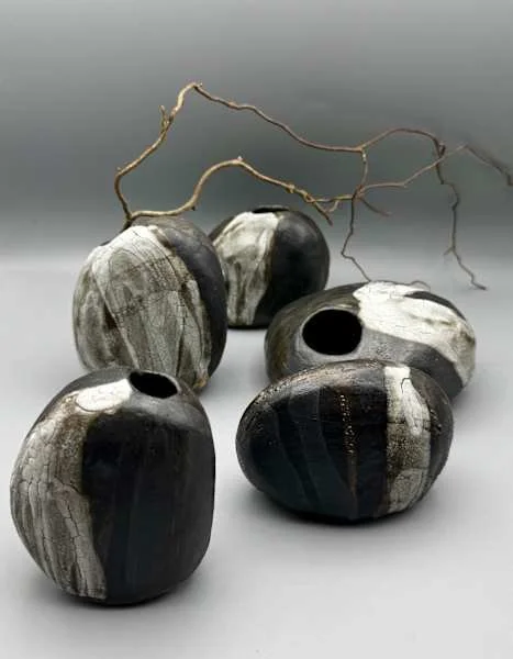 Reaching back into the ages, the Gathered Series, evokes ancient collections of glowing ova --the life force, hand-built bottles perhaps created to hold perfumes, oils, or wine; and budding pods, held in roughhewn wrought iron baskets as if collected for display, transport, or household -- then through the passage of time and turbulence, lost to the ages. The baskets appear hand forged, broken, and old, while merely made of clay and underglaze. The precious contents shimmer with coppery raku glazes combined with the alchemy of fire and the denial of oxygen, or electric kiln fired oxidation crystallin glazes -- like gems, collected preciously to preserve. Wrought, precious, and found project subtle narratives of past lives and lost civilizations dredged up for new eyes, value for the hands that made and collected them.