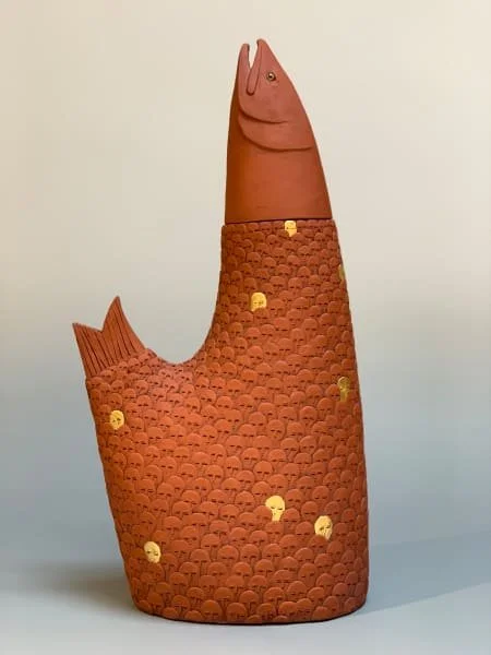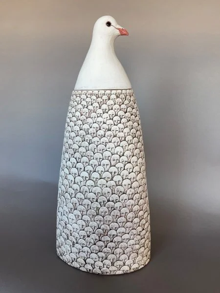 My part time preoccupation with the fate of humanity appears loosely in the surface textures of many of my pieces, especially the face covered pots. While I create these works, I find myself contemplating, learning, and reflecting, refining my process through repetition. Each face begins as a disc of clay that is applied and then sculpted. To me, the surfaces suggest crowds or groups of people.